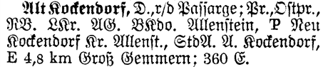 Prov Ostpr. - The Province shows which Province or State the place is located in. Alt Kockendorf is located in Ostpreussen.