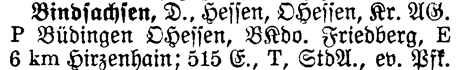 Prov OHessen - The Province shows which Province or State the place is located in. Bindsachsen is located in OHessen.
