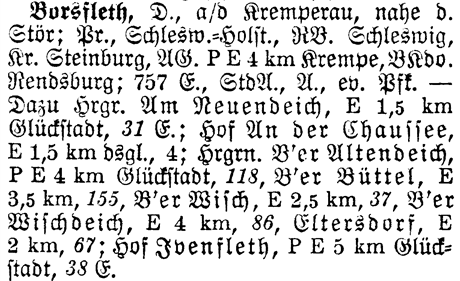 Prov Schlesw. -Holst. - The Province shows which Province or State the place is located in. Borsfleth is located in Schleswig-Holstein.