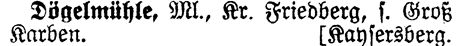 See Gross Karben - A See notation means the entry is dependent on another entry. In this case, Dögelmühle is dependent on Gross Karben, which should be consulted for additional information.