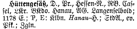 Prov Hess. -N. - The Province shows which Province or State the place is located in. Hüttengesäss Kr. Hanau is located in Hessen-Nassau.