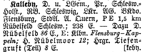 Prov Schlesw. -Holst. - The Province shows which Province or State the place is located in. Kalleby is located in Schleswig-Holstein.