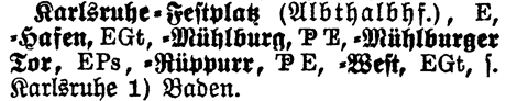 See Karlsruhe 1) Baden - A See notation means the entry is dependent on another entry. In this case, Karlsruhe-Hafen is dependent on Karlsruhe 1) Baden, which should be consulted for additional information.