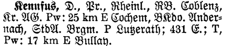 Prov Rheinl. - The Province shows which Province or State the place is located in. Kennfus is located in Rheinland.