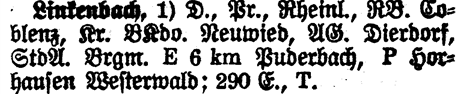 Prov Rheinl. - The Province shows which Province or State the place is located in. Linkenbach is located in Rheinland.