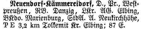 Prov Westpr. - The Province shows which Province or State the place is located in. Neuendorf-Kämmereidorf is located in Westpreussen.